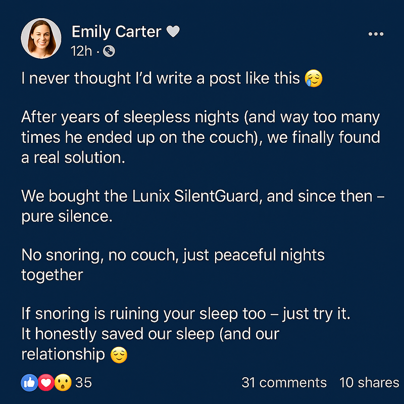 Johan D Nov 2025Verified BuyerMy husband snores like a chainsaw 🤣i used to sleep with earplugs and a pillow over my head. Then came Lunix SilentGuard, and boom silence. I can finally fall asleep next to him again without plotting his demise